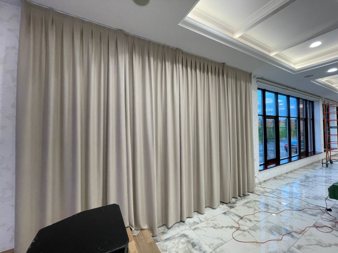 Безопасность превыше всего: Для пошива портьер использовались специальные негорючие ткани с сертификатом, что полностью соответствует строгим нормам противопожарной безопасности для общественных заведений.