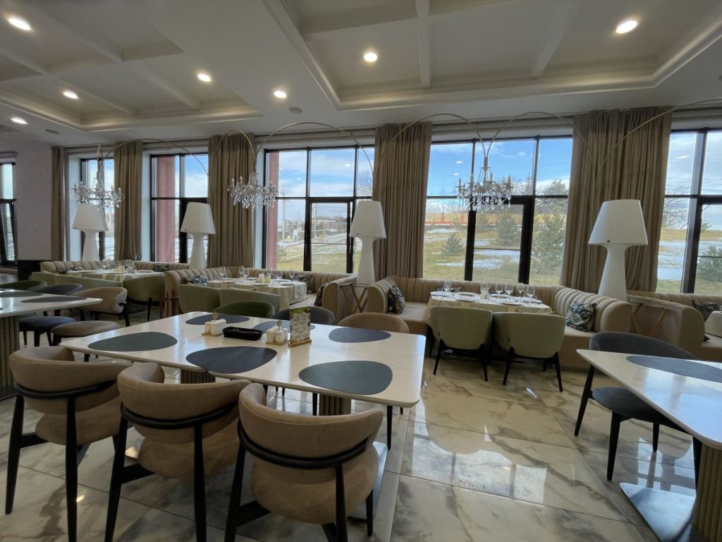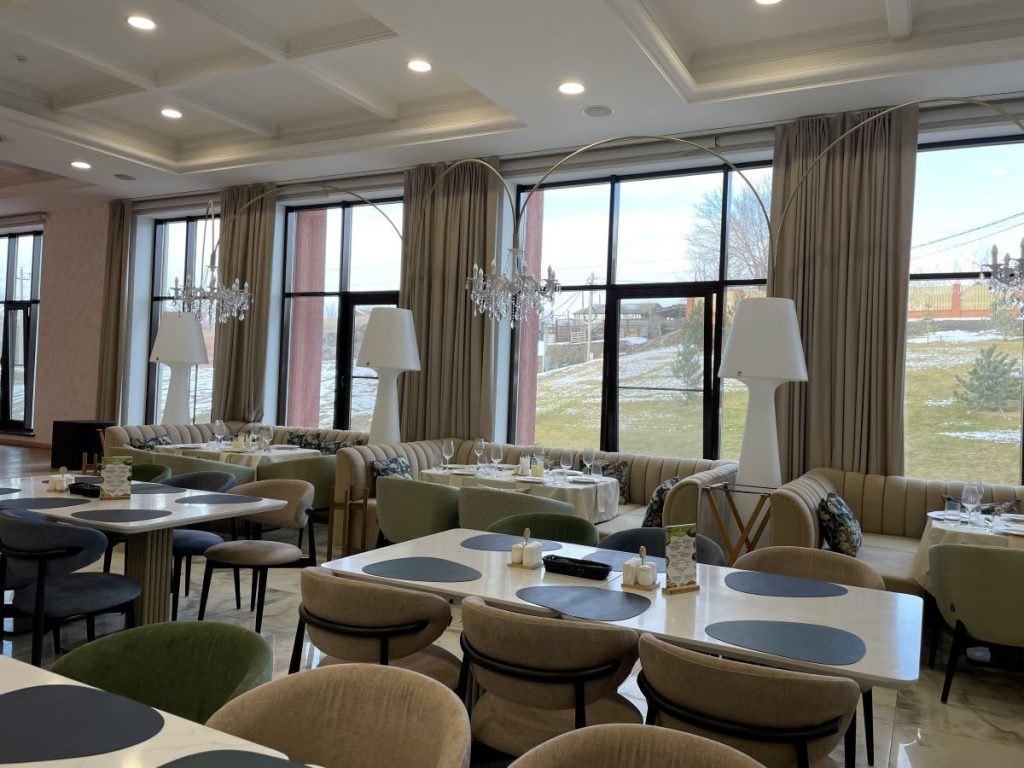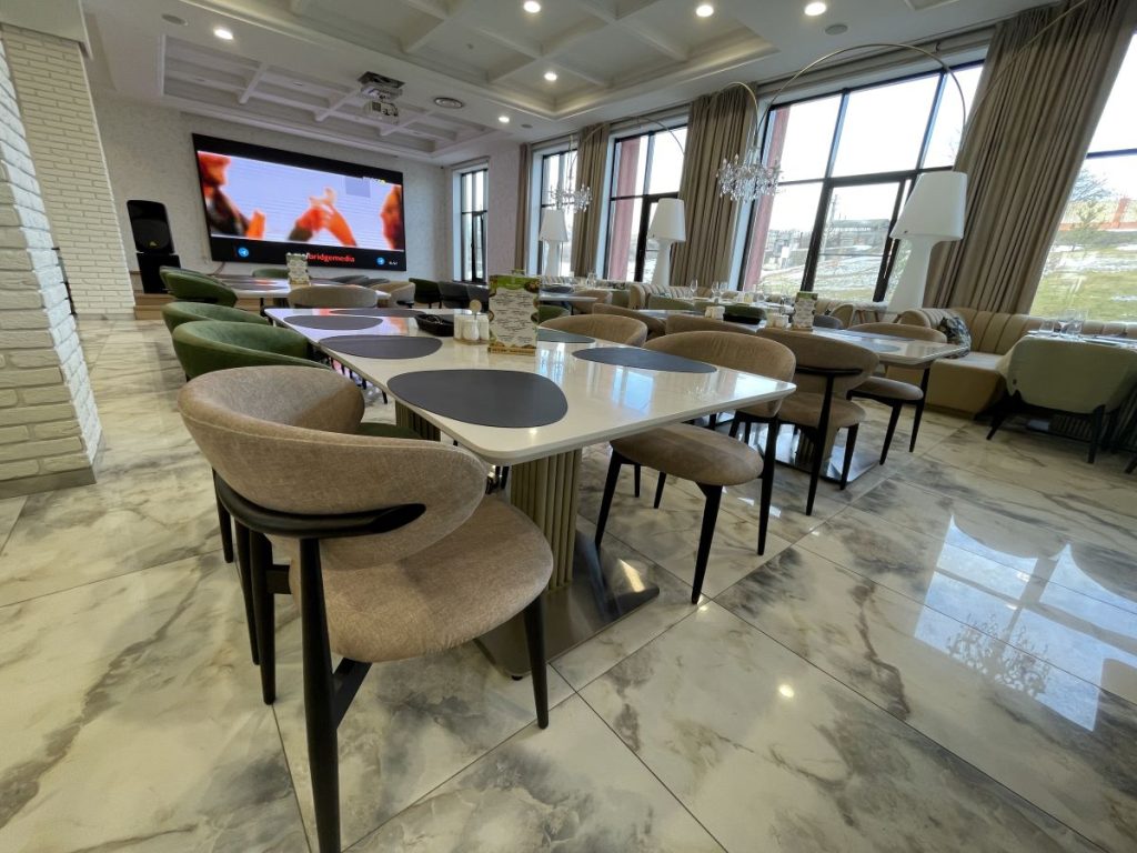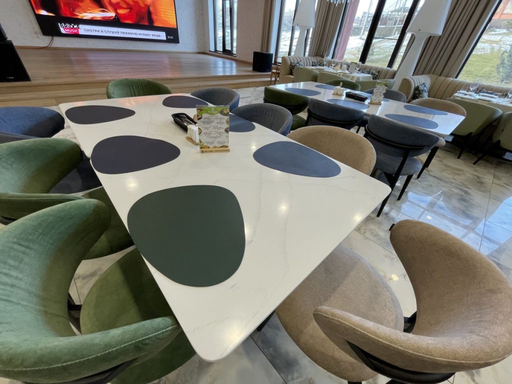 Главной особенностью этого проекта стало сочетание эстетики, безопасности и современных технологий. Для создания уютной, но при этом практичной атмосферы в зале ресторана были использованы специальные ткани, производство Италия, не поддерживающие горение. Ткани для кресел и подушек — обивочные ткани Жаккард страна Китай. Все материалы имеют необходимые сертификаты, что критически важно для помещений с высокой проходимостью.