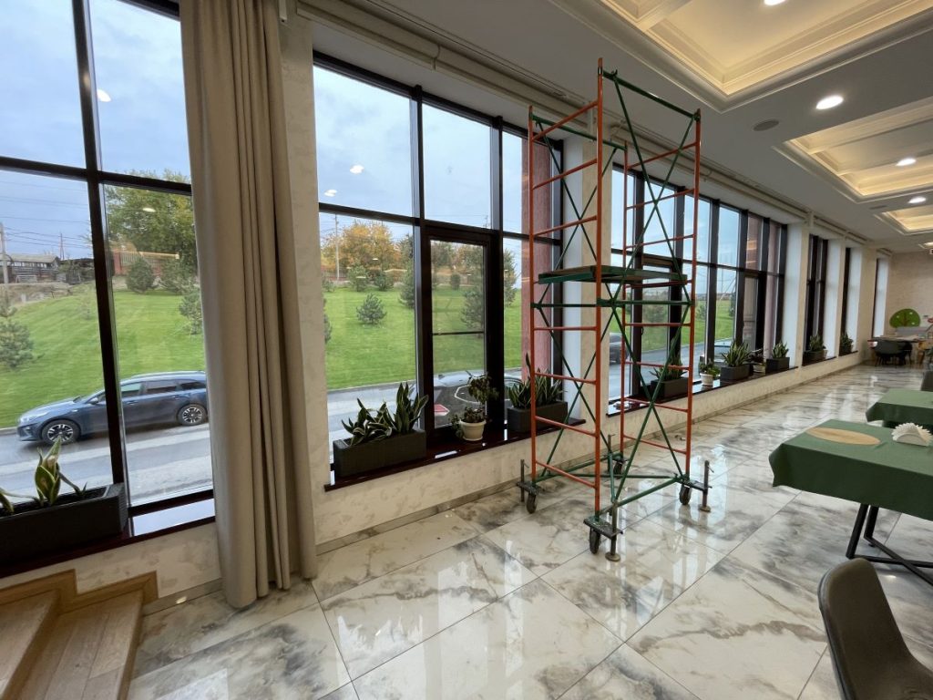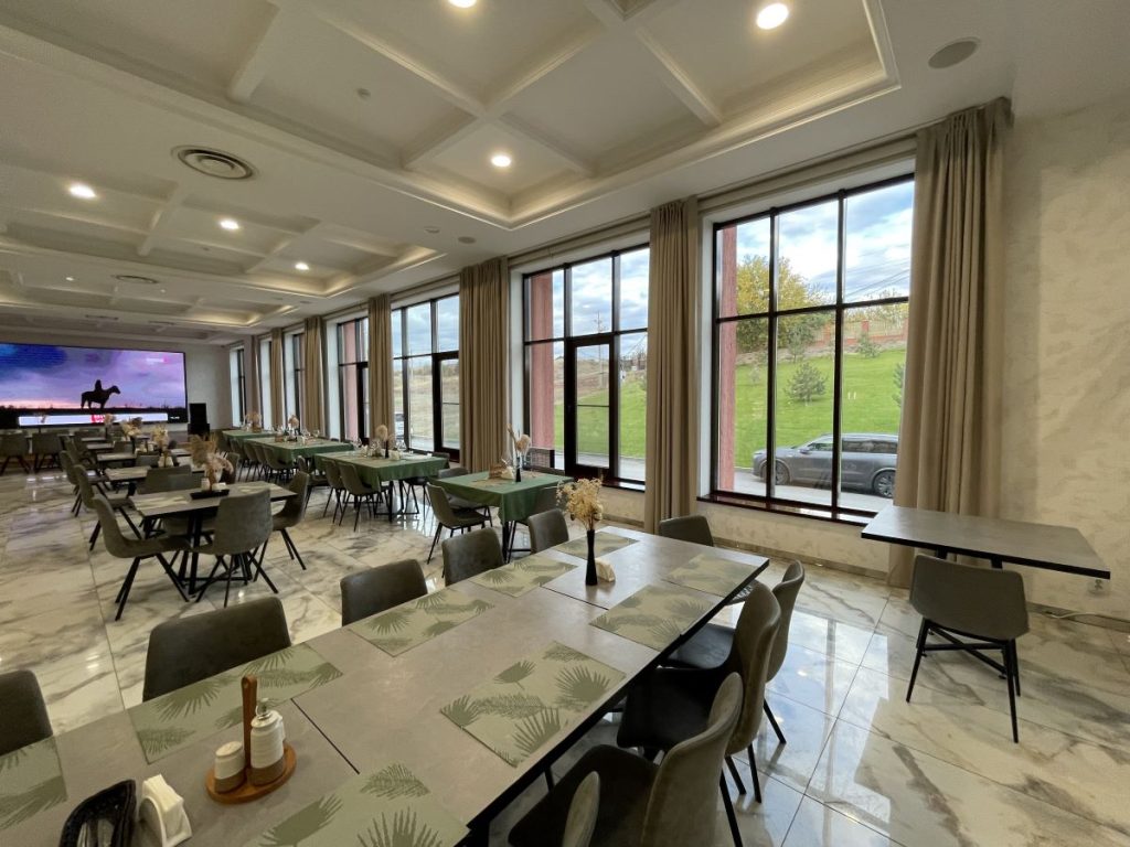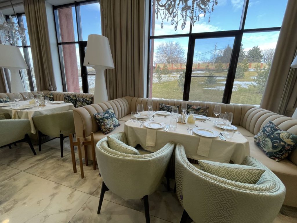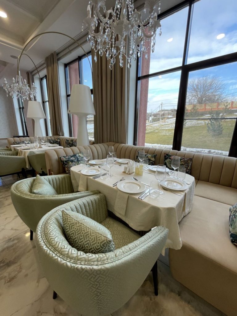 Главной особенностью этого проекта стало сочетание эстетики, безопасности и современных технологий. Для создания уютной, но при этом практичной атмосферы в зале ресторана были использованы специальные ткани, производство Италия, не поддерживающие горение. Ткани для кресел и подушек — обивочные ткани Жаккард страна Китай. Все материалы имеют необходимые сертификаты, что критически важно для помещений с высокой проходимостью.