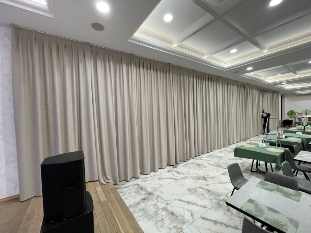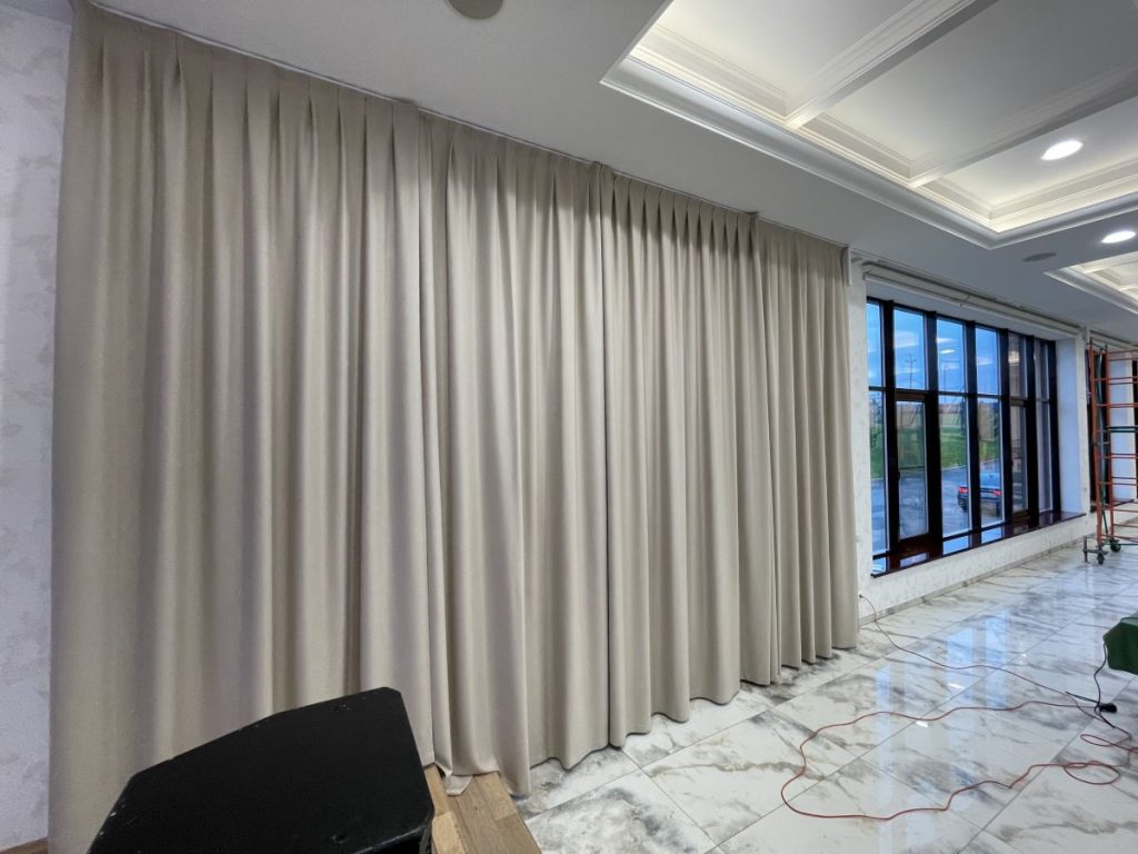 Что было сделано: Пошив штор на заказ, поставка и установка электрокарнизов.